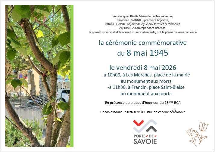 La cérémonie commémorative du 8 mai 1945 aura lieu le vendredi 8 mai 2026.