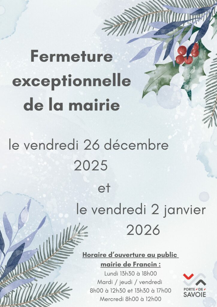 Fermeture exceptionnelle de la mairie les 26/12/2025 et 02/01/2026