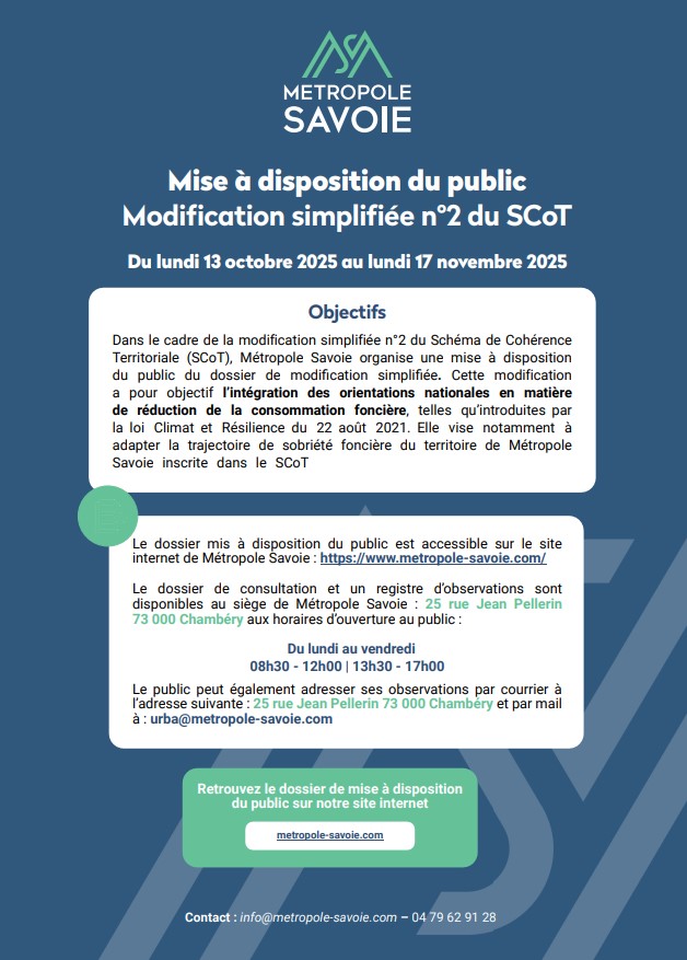 Dans le cadre de la modification simplifiée n°2 du Schéma de Cohérence Territoriale (SCoT), du lundi 13 octobre 2025 au lundi 17 novembre 2025, Métropole Savoie organise une mise à disposition du public du dossier de modification simplifiée.