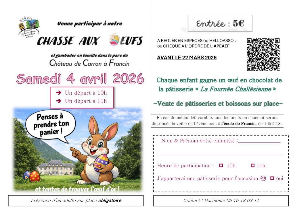 L’association APEAEF organise à l’occasion des fêtes de Pâques sa traditionnelle chasse aux œufs le samedi 4 avril 2026, au Château de Carron à Francin.