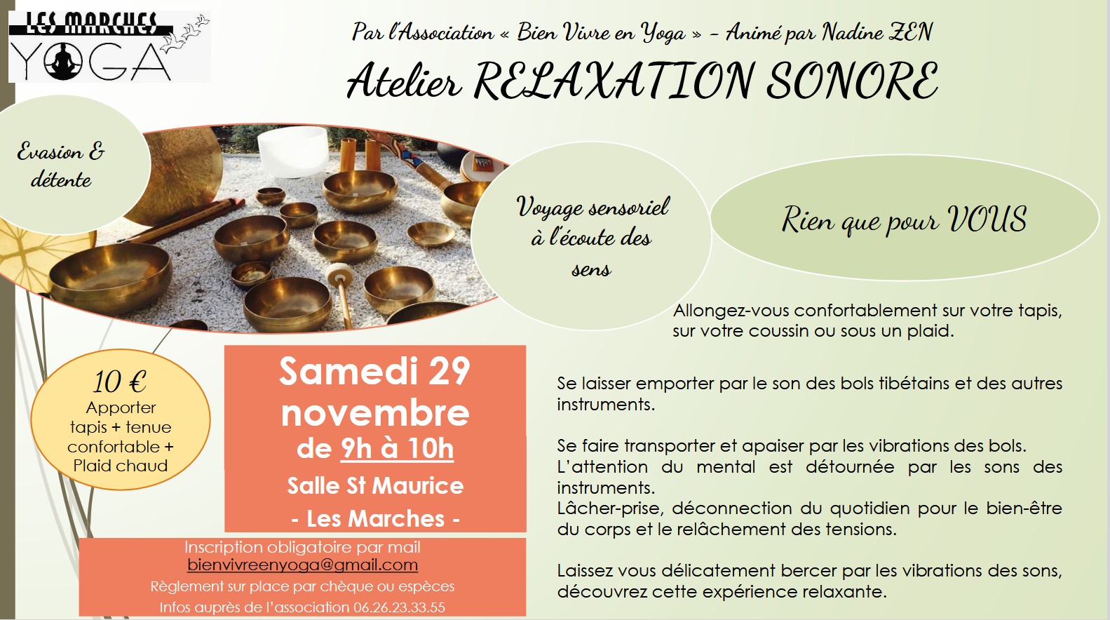 L’association Bien vivre en yoga organise un atelier de relaxation sonore le samedi 29 novembre de 9h00 à 10h00 en salle Saint-Maurice Les Marches.