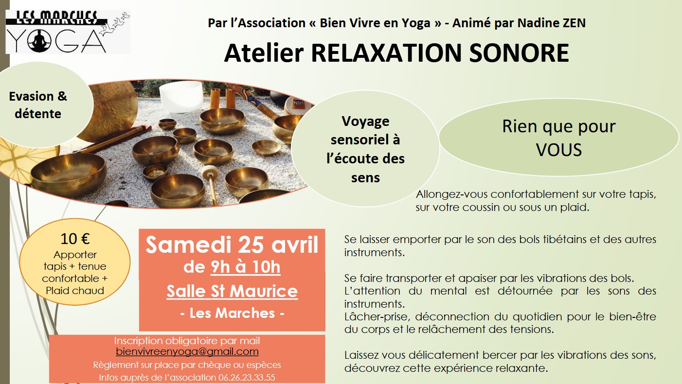 L’association Bien vivre en yoga organise un atelier de relaxation sonore le samedi 25 avril de 9h00 à 10h00 en salle Saint-Maurice Les Marches.