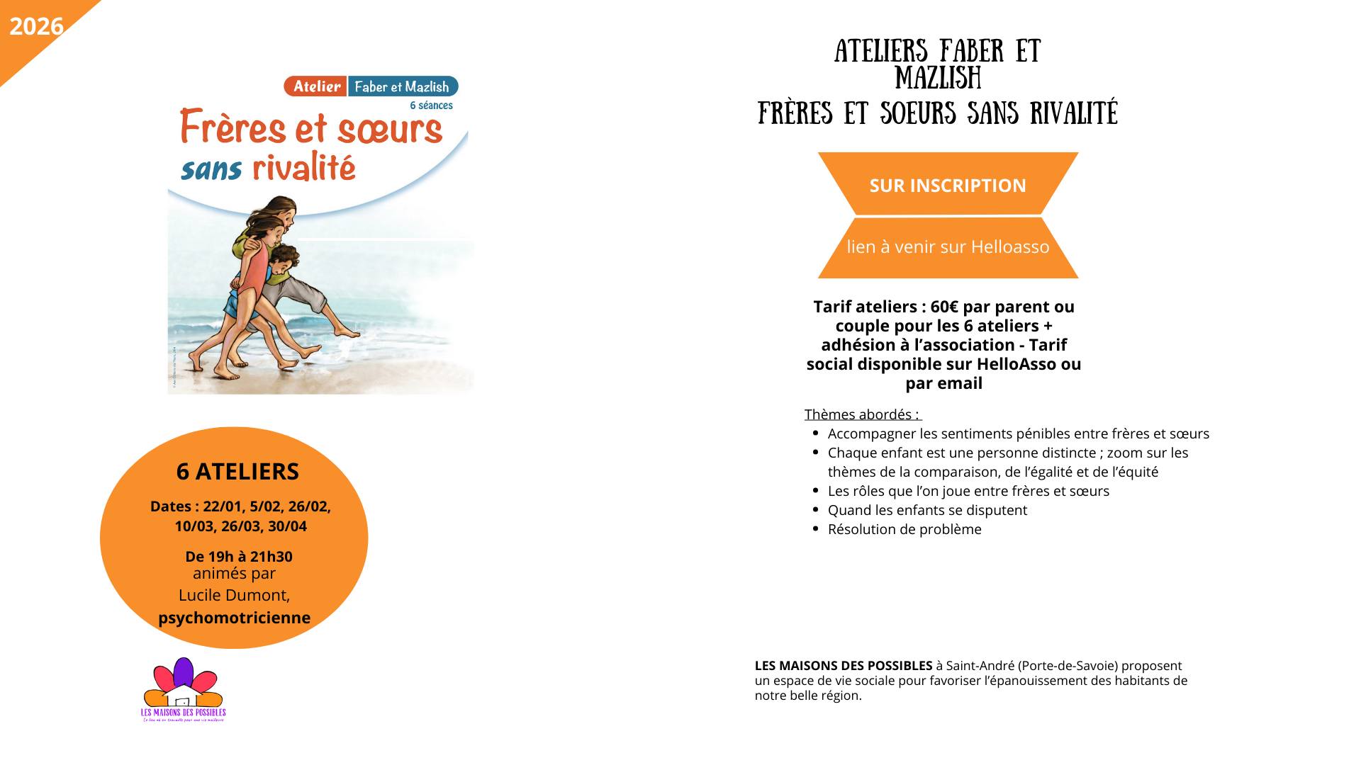 L’association Maisons des Possibles organise une réunion d’information sur les ateliers « Les rivalités dans la fratrie » le jeudi 22 janvier de 19h00h à 21h30, à St André.