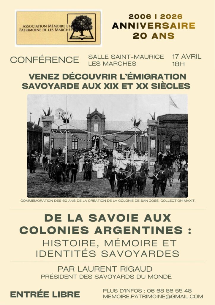 L’association Mémoire et Patrimoine de Les Marches organise une conférence « De la Savoie aux colonies argentines, l’émigration savoyarde aux XIX et XX siècles » par Laurent RIGAUD, le vendredi 17 avril à 18h00, salle Saint-Maurice, Les Marches.