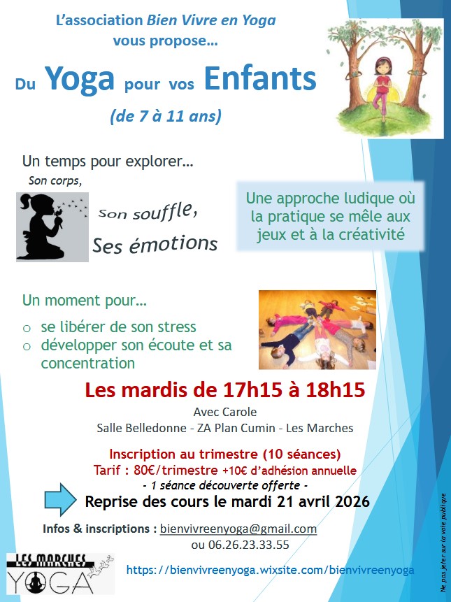L’association Bien Vivre en Yoga propose du yoga pour vos enfants (de 5 à 11 ans) les mardis de 17h15 à 18h15 en salle Belledonne, ZA Plan Cumin sur Les Marches.