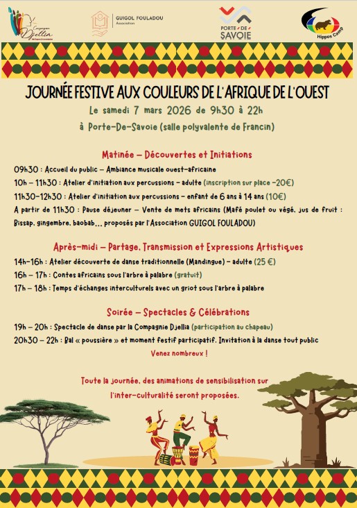 Cette journée mettra à l’honneur les cultures d’Afrique de l’Ouest à travers la musique (percussions), la danse et les arts traditionnels avec la Compagnie Djellia (Chambéry) invitée pour l’occasion. En outre, la restauration sera assurée par l’association Guigol Fouladou (Montmélian) pour la découverte culinaire de mets ouest-africains. Cette démarche artistique et culturelle permettra aux habitants de Porte-de-Savoie de vivre une expérience collective accessible à tous, contribuant à l’animation du territoire, au rapprochement des générations.