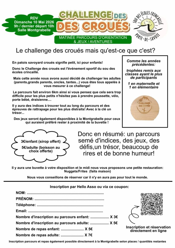 Donc le Challenge des croués est l’événement sportif du sou des écoles crincaillé. Mais cette année nous avons aussi décidé de challenger les adultes (parents, grands-parents, oncles, tantes…). Vous êtes tous appelés à vous mesurer à ce challenge ! Le parcours fait environ 6km ainsi si vous pensez que cela sera trop difficile pour les plus petits n’hésitez pas à prendre poussette, vélo, porte-bébé, draisienne…. Il y aura des indices à trouver tout au long du parcours et des épreuves de rattrapage pour les plus distraits ! Avec à la clé un trésor… Des jeux seront également disponibles à la Montgrabelle pour ceux qui préféreraient rester à proximité de la buvette !