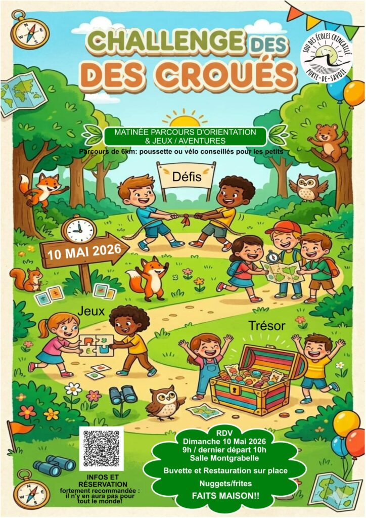 Donc le Challenge des croués est l’événement sportif du sou des écoles crincaillé. Mais cette année nous avons aussi décidé de challenger les adultes (parents, grands-parents, oncles, tantes…). Vous êtes tous appelés à vous mesurer à ce challenge ! Le parcours fait environ 6km ainsi si vous pensez que cela sera trop difficile pour les plus petits n’hésitez pas à prendre poussette, vélo, porte-bébé, draisienne…. Il y aura des indices à trouver tout au long du parcours et des épreuves de rattrapage pour les plus distraits ! Avec à la clé un trésor… Des jeux seront également disponibles à la Montgrabelle pour ceux qui préféreraient rester à proximité de la buvette !