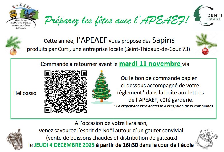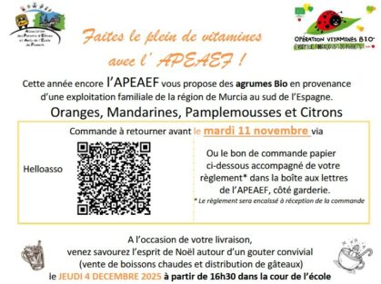 L’APEAEF organise une vente d’agrumes et de sapins le jeudi 4 décembre 2025 à 16h30 dans la cour de l’école de Francin.