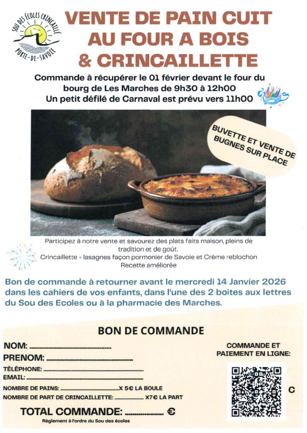 Le Sou des Écoles Crincaillé organise une vente de pain/crincaillette le dimanche 1er février de 9h30 à 12h00 dans le Bourg Les Marches.