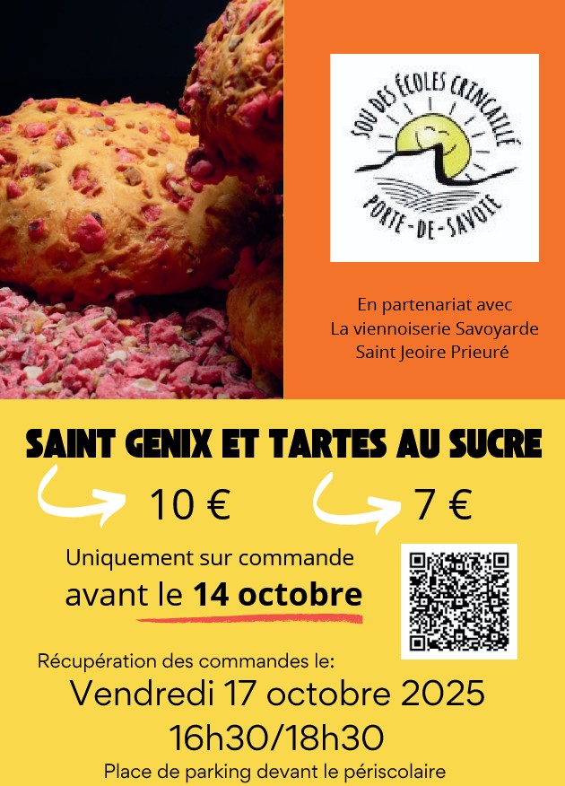 L’association Sou des écoles Crincaillé organise une vente de Saint Genix et tarte au sucre le vendredi 17 octobre 2025.