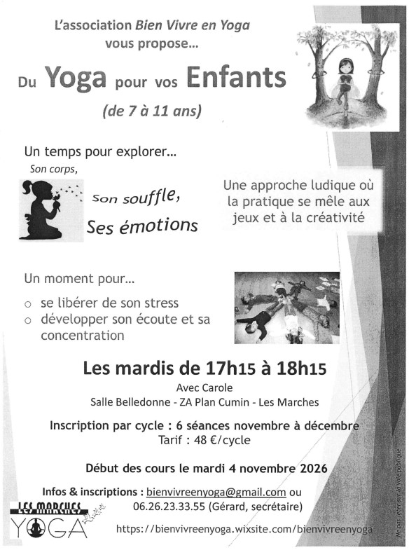 L’association Bien Vivre en Yoga propose du yoga pour vos enfants (de 7 à 11 ans) les mardis de 17h15 à 18h15 en salle Belledonne sur Les Marches.