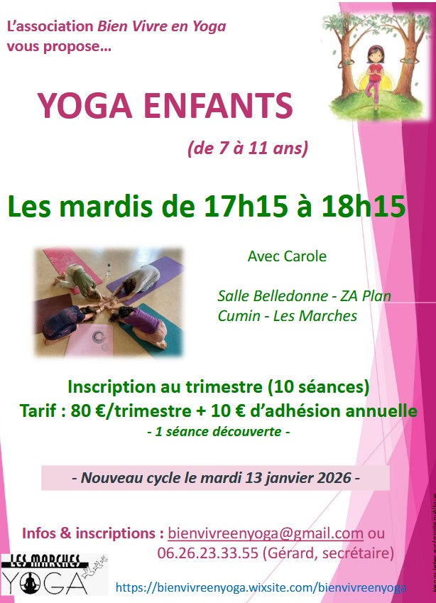 L’association Bien Vivre en Yoga propose du yoga pour vos enfants (de 7 à 11 ans) les mardis de 17h15 à 18h15 en salle Belledonne, ZA Plan Cumin, Les Marches.