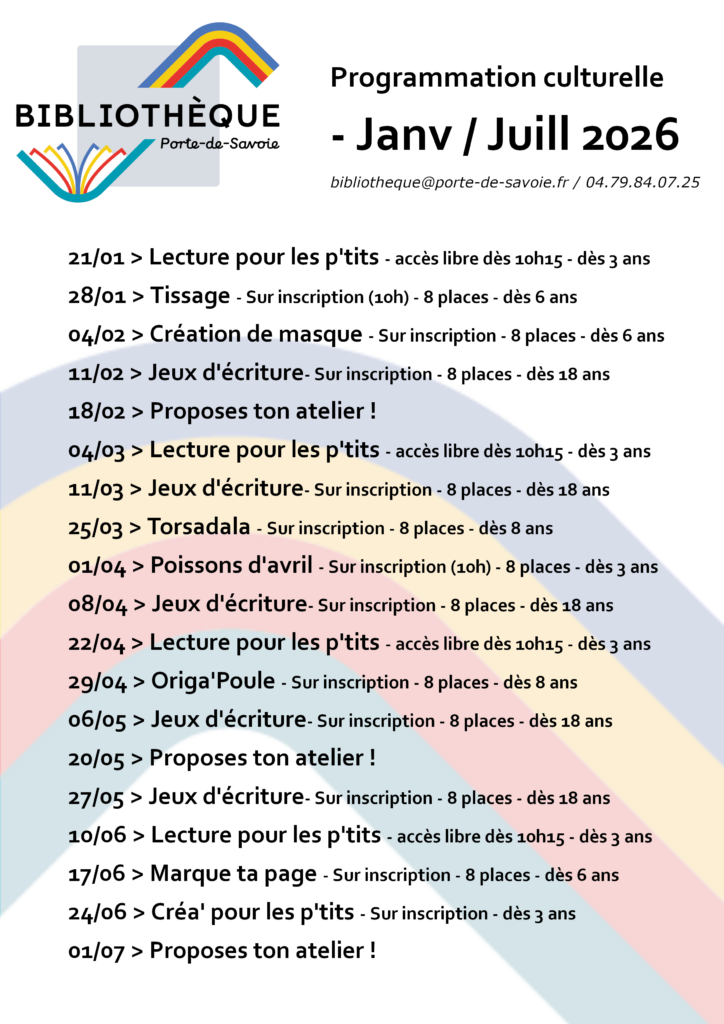 La bibliothèque de Porte-de-Savoie vous propose des ateliers gratuits sur inscription auprès de la bibliothèque par mail ou par téléphone.